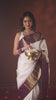White silk saree adorned with Mayil Chakram, Neli, and Muthu stripes, featuring a contrast border with Laddu Kamalam, Mayil, Yaali, and Mayil Kann designs, along with a Jaal design pallu