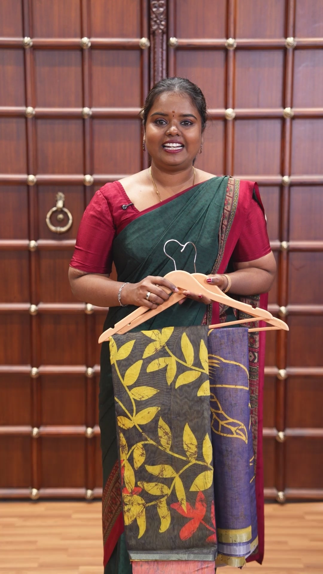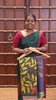 Yellow and black batik print and leaf vine printed linen saree, zari piping border, printed pallu, and a contrast batik printed blouse