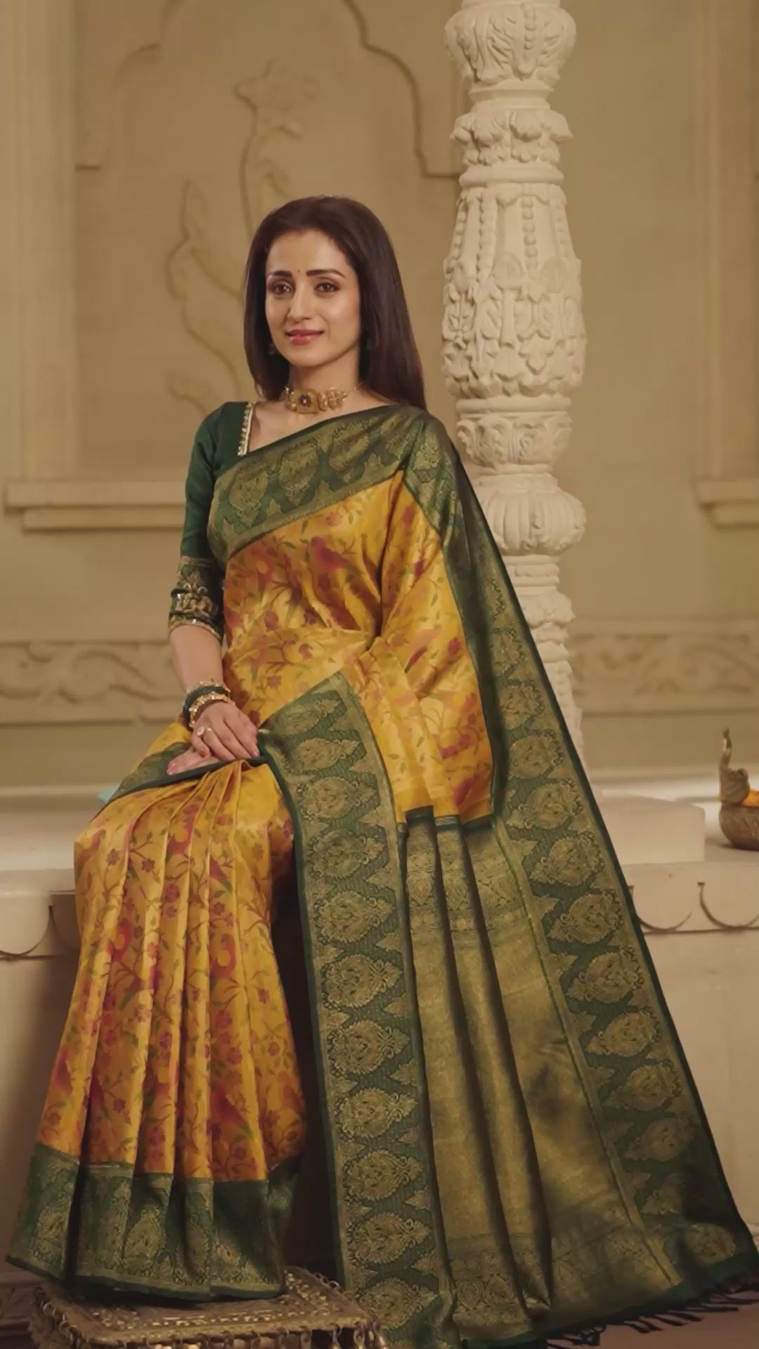 Yellow floral & bird meenakari jacquard silk saree, contrast rekku border of mayil designs & grand zari-rich intricate pallu